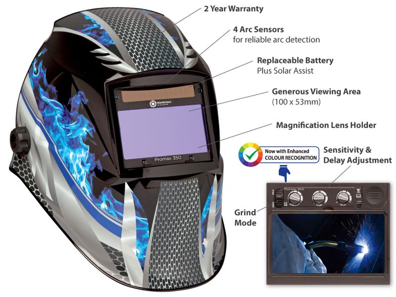 Our most popular auto-darkening welding helmet. The PROMAX 350 electronic welding helmet is suitable for MIG, Stick & TIG welding. Stand-out features include; 4 sensors for reliable switching & a generous viewing area, larger than many other helmets in this class. Variable Shade 9-13, Sensitivity & Delay Adjustments, Grind-Mode switch, replaceable battery, magnification lens holder & more. Comfortable, very lightweight & superior optics.